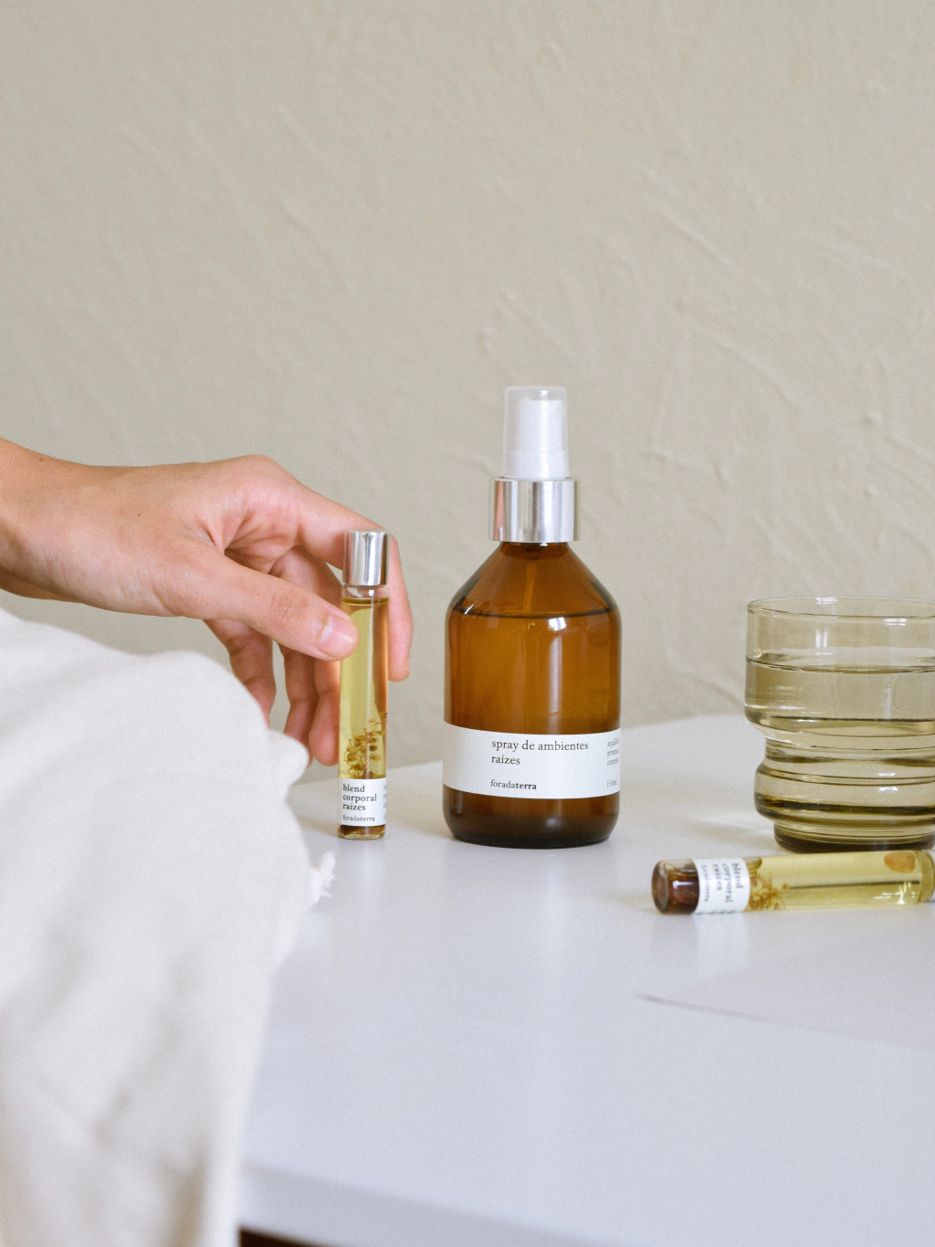 spray de ambientes linha raízes, com mix de aroma amadeirado, terroso, picante e adocicado